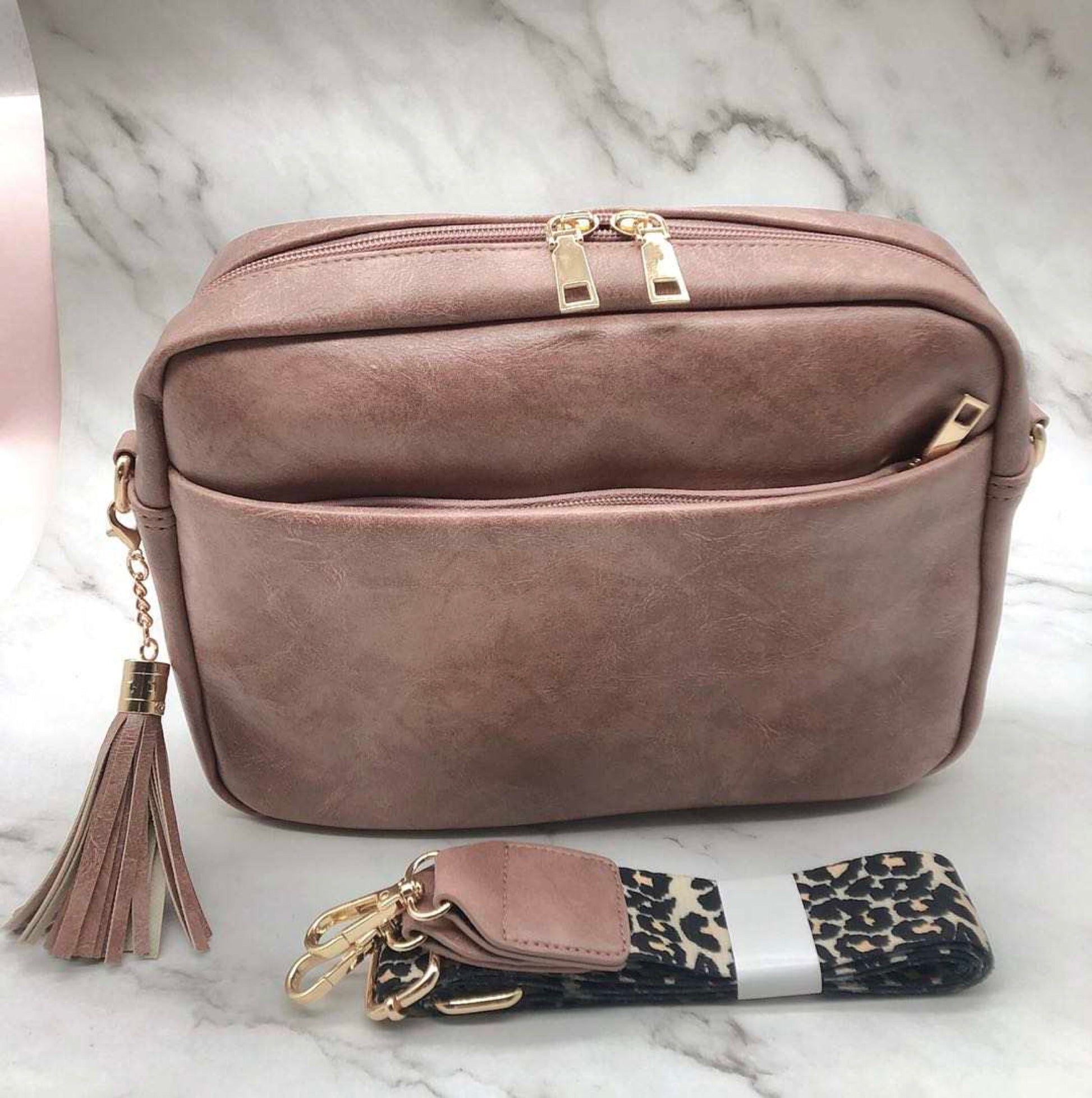 They feature 1 main zip compartment, as well as a front zip pocket for securely storing items! Make it a purse, travel bag, and so much more. Also comes with an animal print shoulder/crossbody strap.