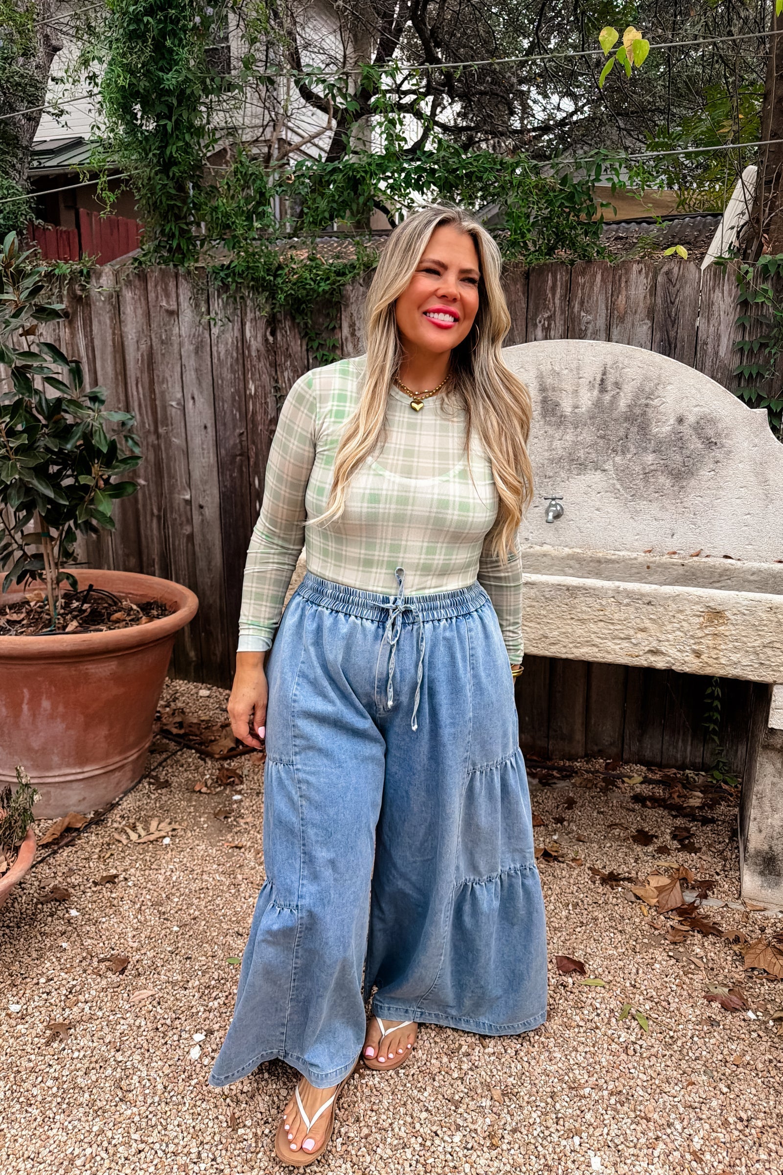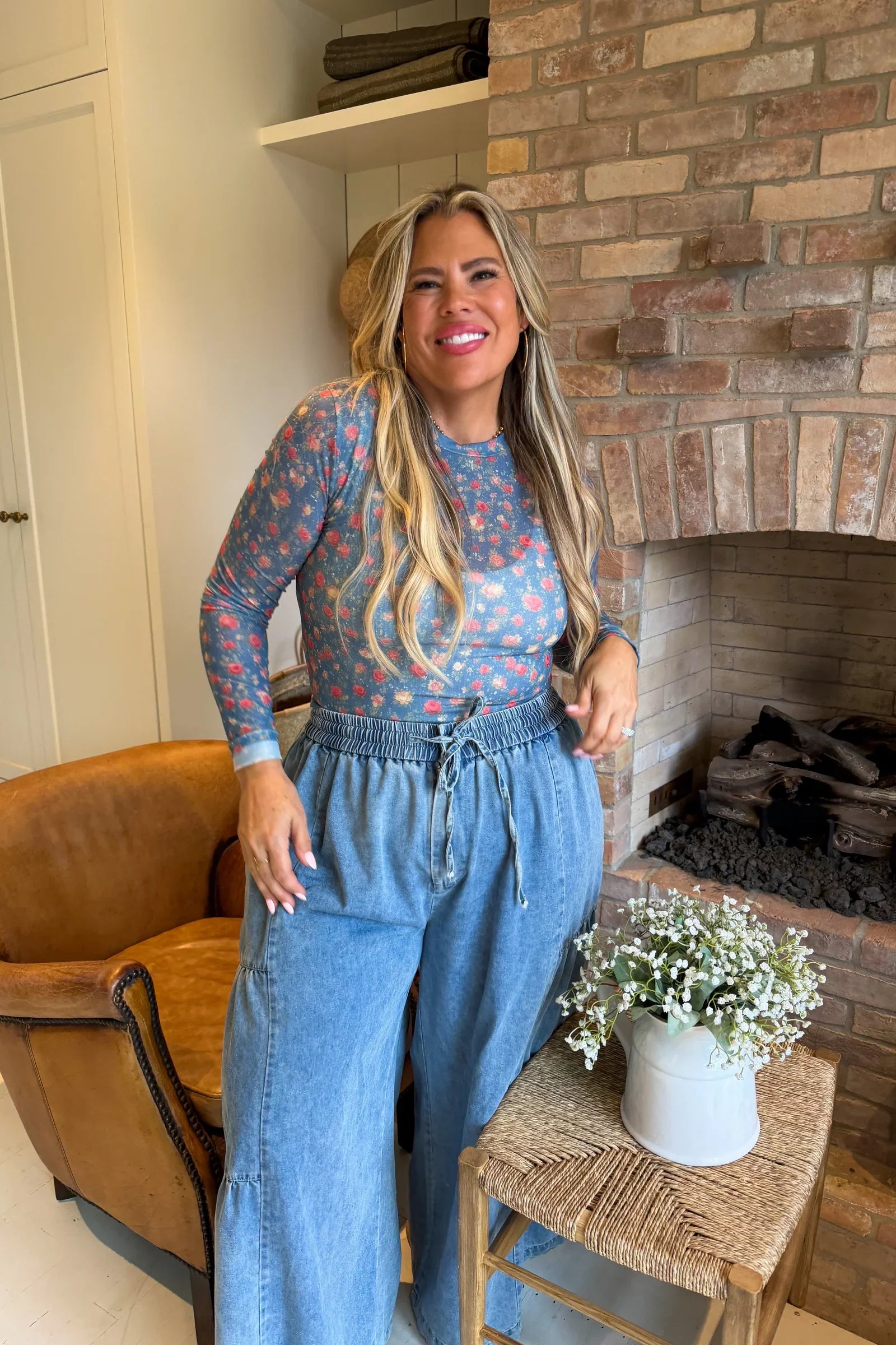 OUR FARMHOUSE INSPIRED SPRING PRINTS ARE HERE!! Super cute for layering, this sultry stretchy mesh print long-sleeve top features a totally sheer design. Perfect worn alone or paired under your favorite cardigan, vest or sweater! Crew neck and thumbhole details.